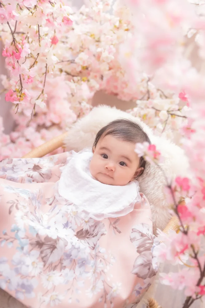 A. もちろんです!「100日間の無事な成長への感謝」と「これからの健やかな毎日」を願う気持ちがあれば、写真は自由で良いのです。重厚な産着と、柔らかな桜のコントラストは、まさにこの時期だけの特別なビジュアル。