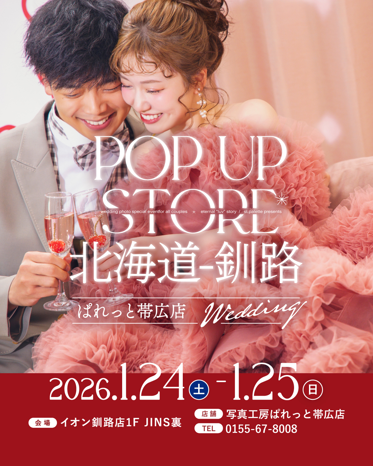 こんにちは。 北海道帯広市にある写真工房ぱれっと帯広店です! 今年1月と4月に行い、大好評だった、 写真工房ぱれっと帯広店の釧路POP-UPストアを、 2026年1月24日・25日に開催します💖 今回はロケーションウェディングの受付も開始! ウェディングロケーションのあれこれを聞きに来ませんか?