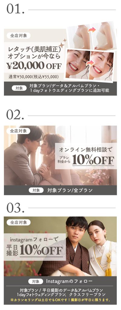 ほかのキャンペーン内容と併用可能です。お好きなプランでおふたりらしい撮影をお得にお楽しみください!