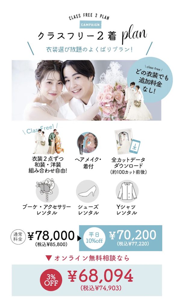 今回はブライダルに登場したクラスフリープランのご紹介です!! 通常着る衣装によってお値段が変わるブライダルの撮影ですが、 なんとこちらのプランはどの衣装を選んでも お値段変わらずのクラスフリーなんです! お得なプランの詳細はこちらをチェック!!