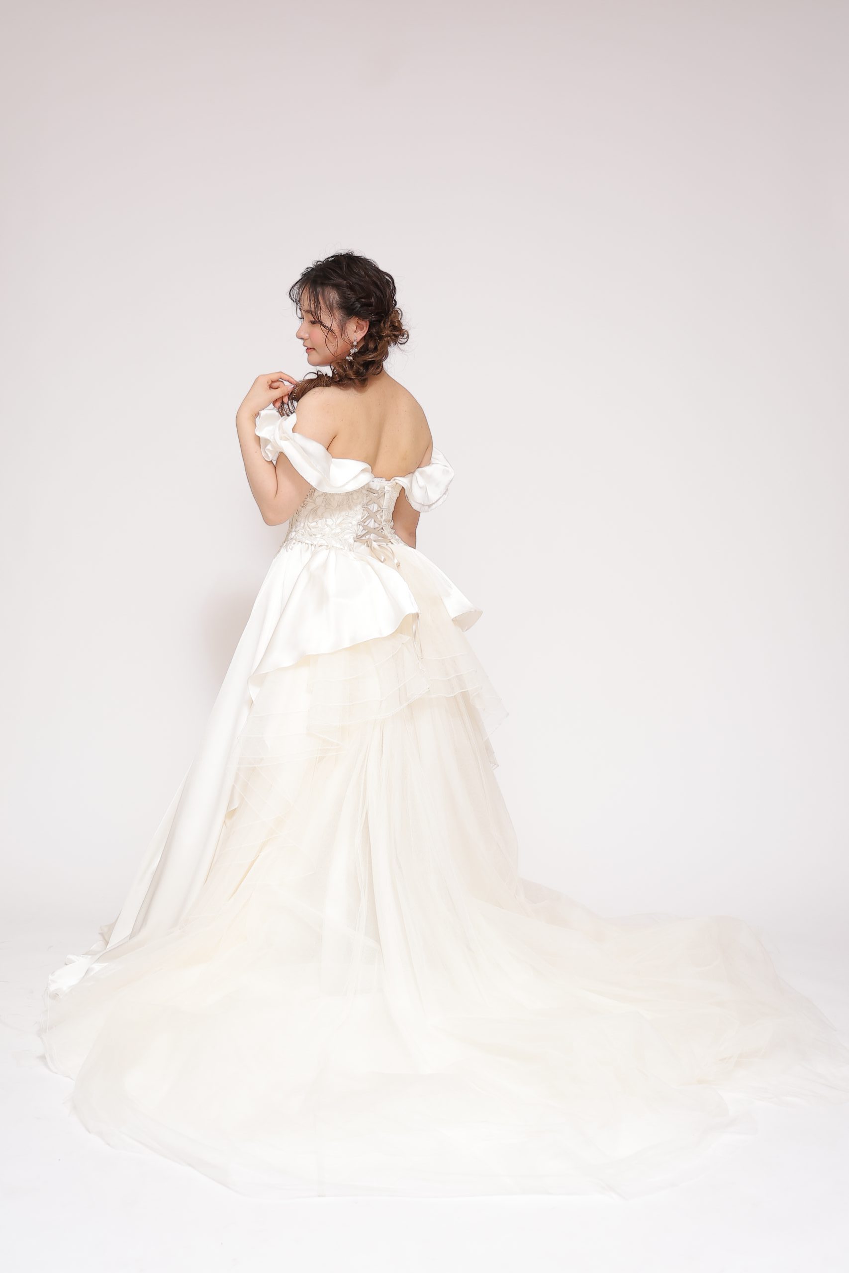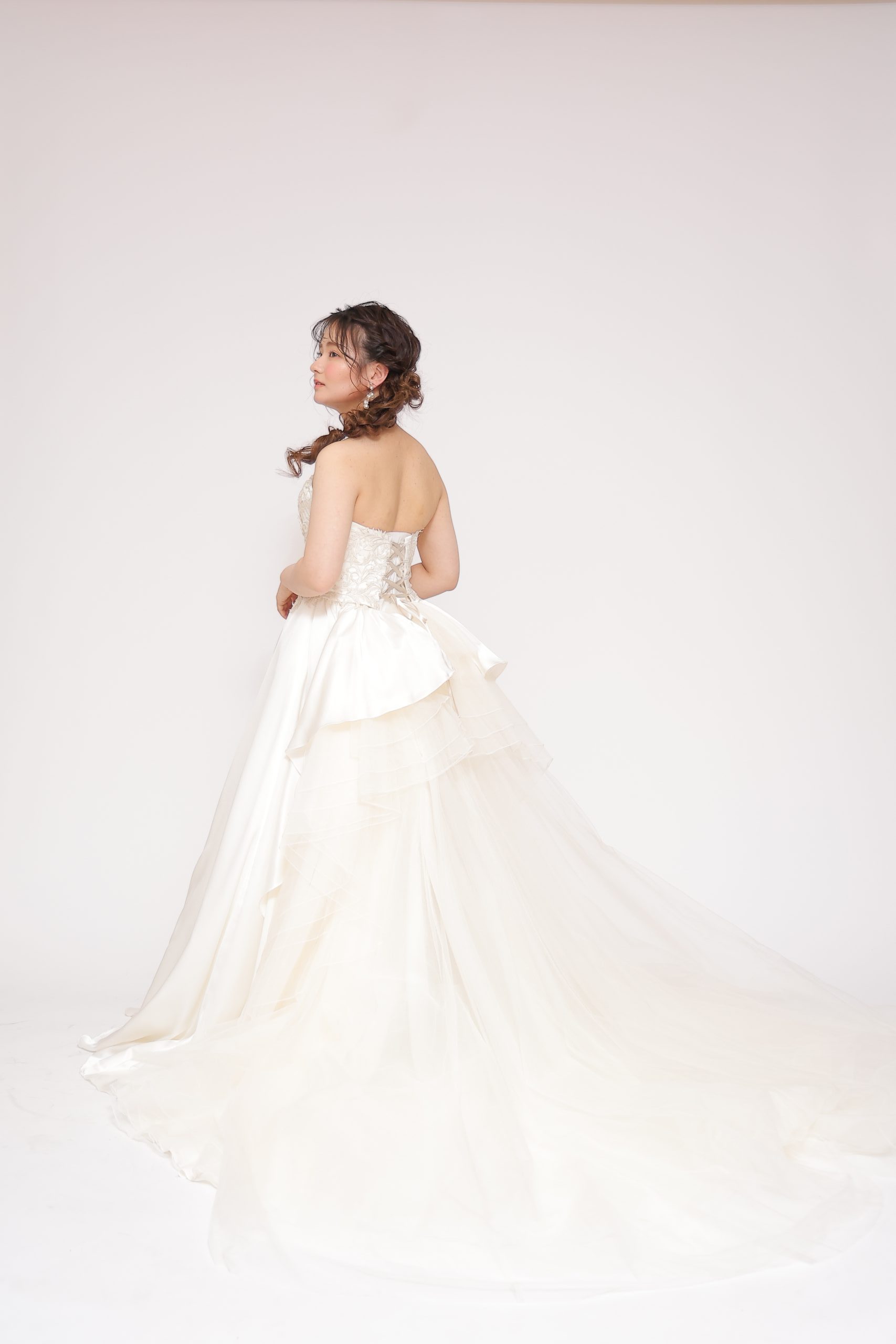前からはシンプルに見えますが、後ろを向く違う生地でトレーンになっており後ろ姿もとっても素敵✨