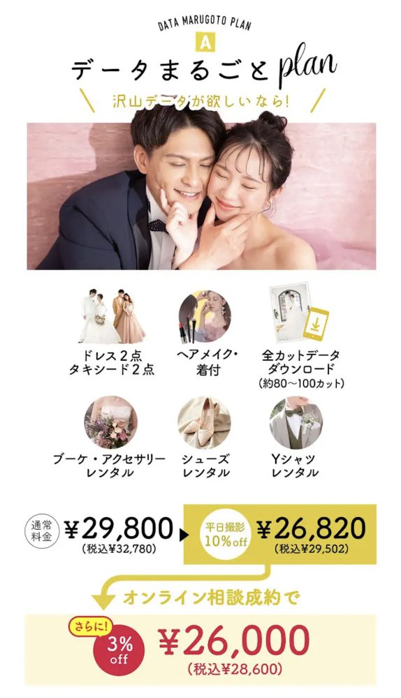 こんにちは!ぱれっと帯広店です! データだけを残したい方や予算を抑えたい方必見! お得な【データまるごとプラン】をご紹介します! ぱれっとのフォトウェディングは様々なプランをご用意しておりますので是非参考にしてみて下さい!