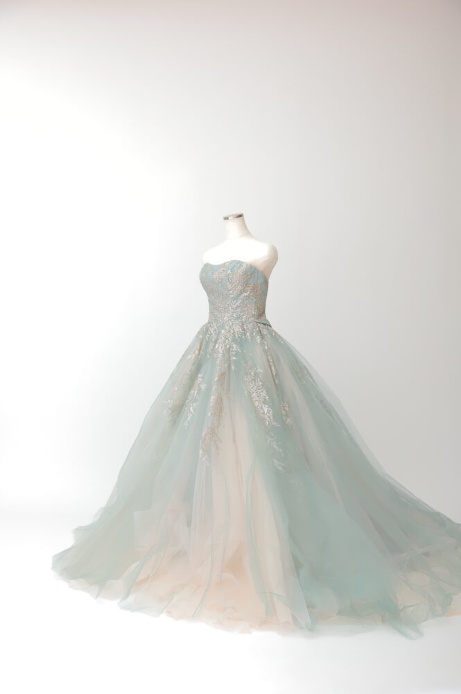 くすみミントブルーのカラーにラメが煌めくとっても綺麗なドレスです。