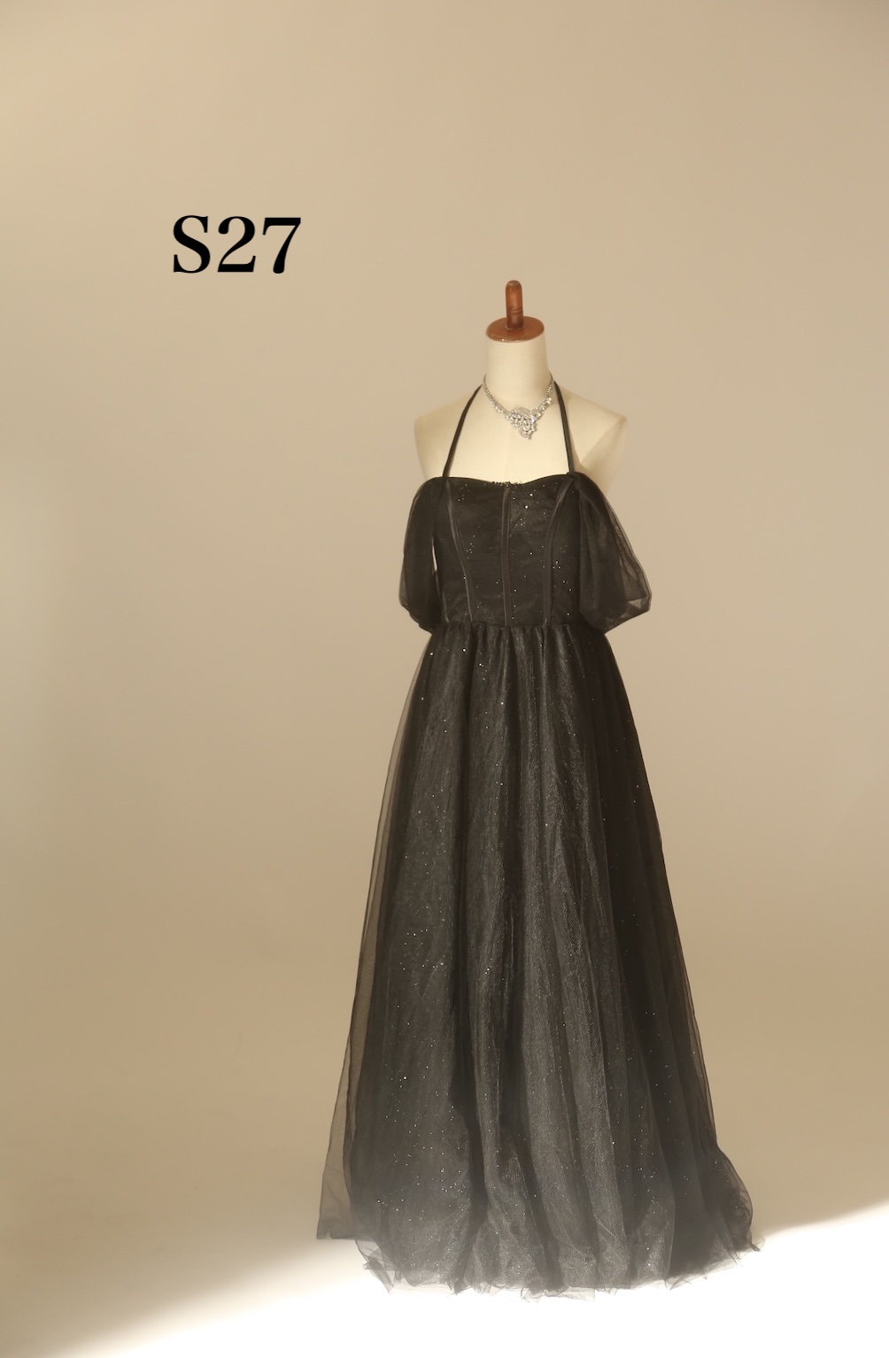 細かいラメが全体に散りばめられている品のあるブラックドレス。