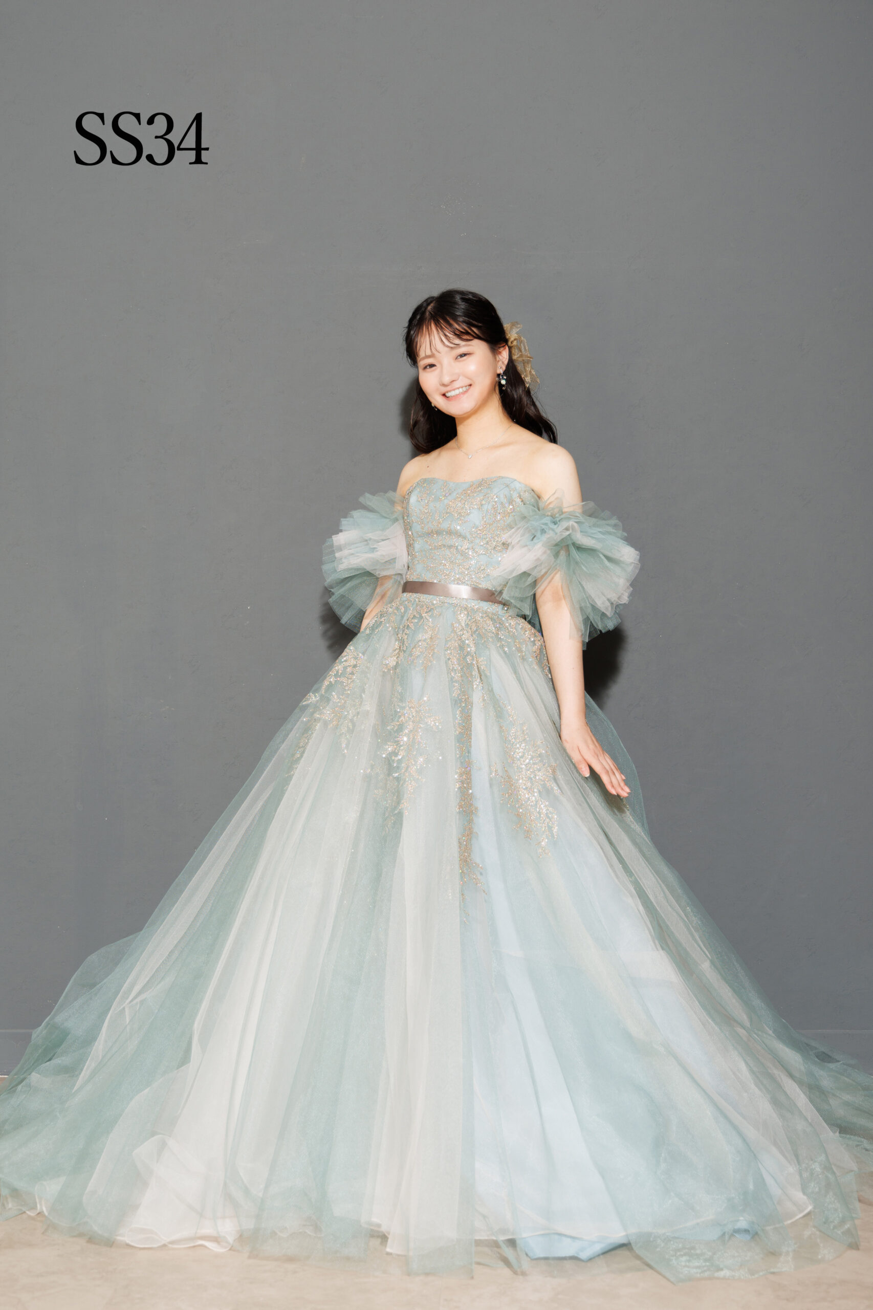 お色味はくすみミントブルーで他にない華やかな1着となっております。