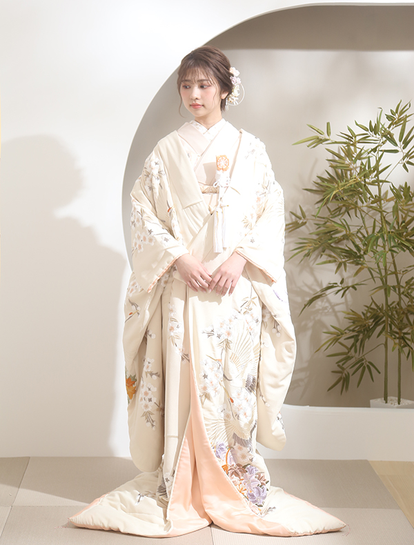 ピンクベージュの生地に、鶴や桜が刺繍された柔らかい印象のお着物。