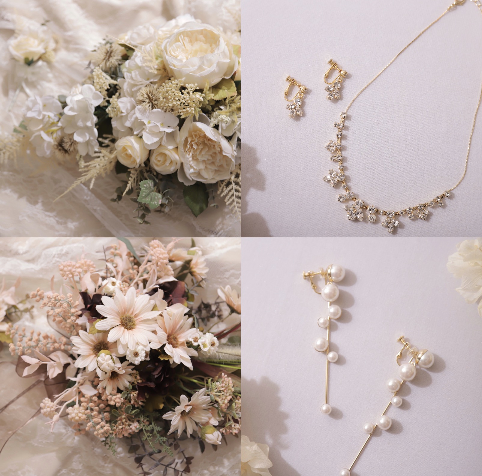 ウェディングドレス用のブーケ、カラードレス用のブーケ、シルバー・ゴールドアクセサリーをお持ちするので