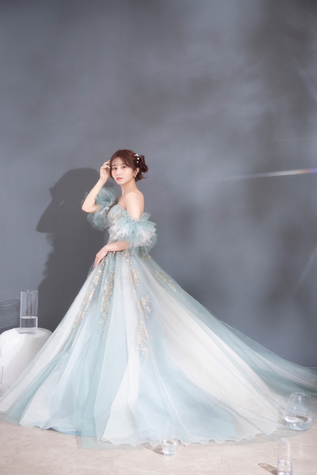 グレーブルーの珍しいお色味の1着。腕のパフは取り外し可能です◎
