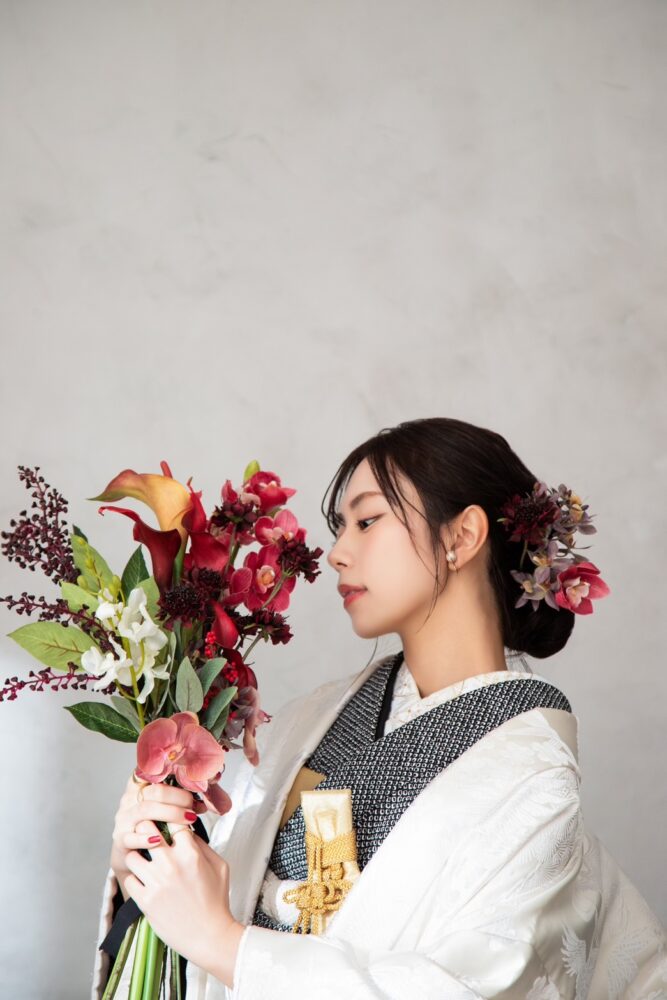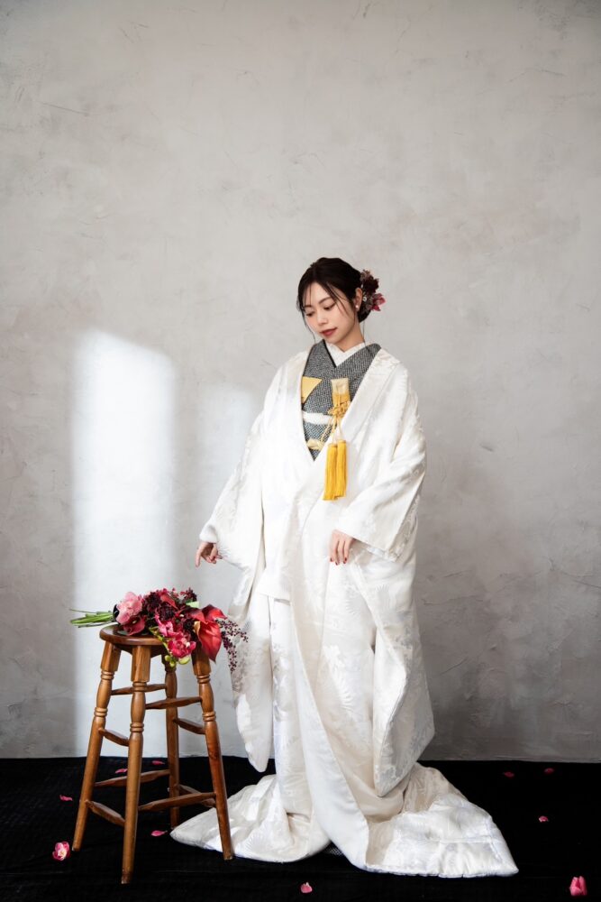 お衣装は、白無垢に黒を合わせたシンプルな組み合わせとなっておりますがそのシンプルさが