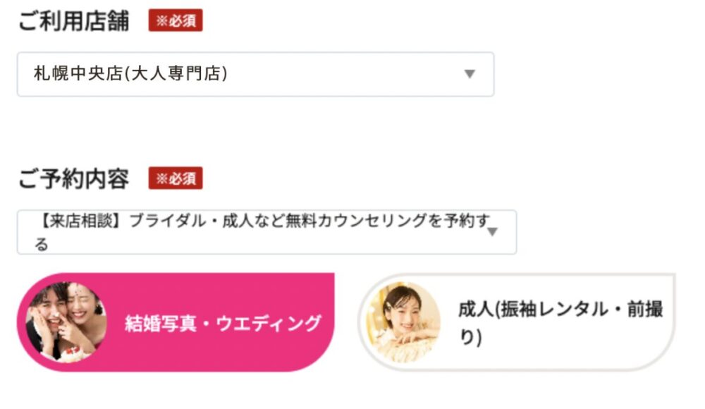 1.ご希望店舗:“帯広店” ご予約内容:“結婚写真・ウエディング”を選択