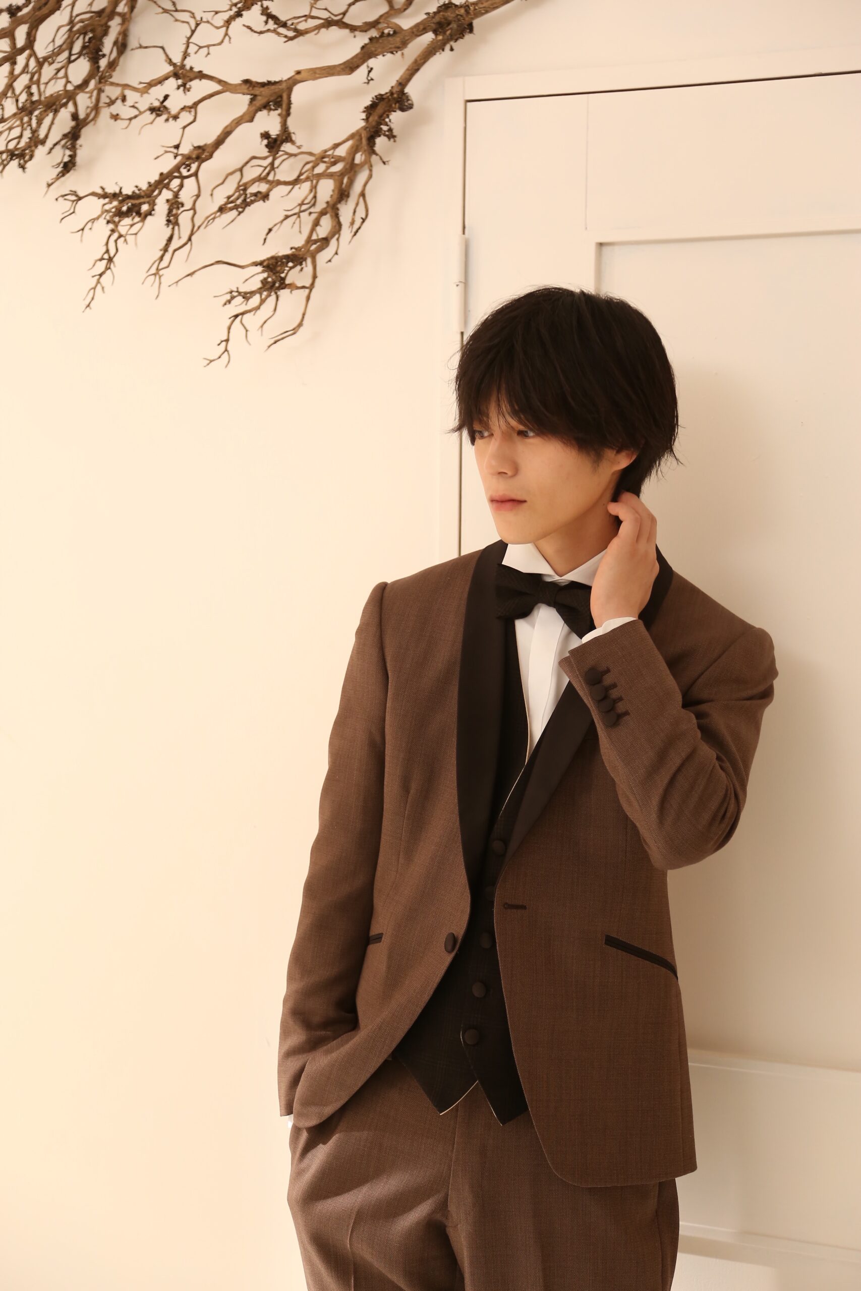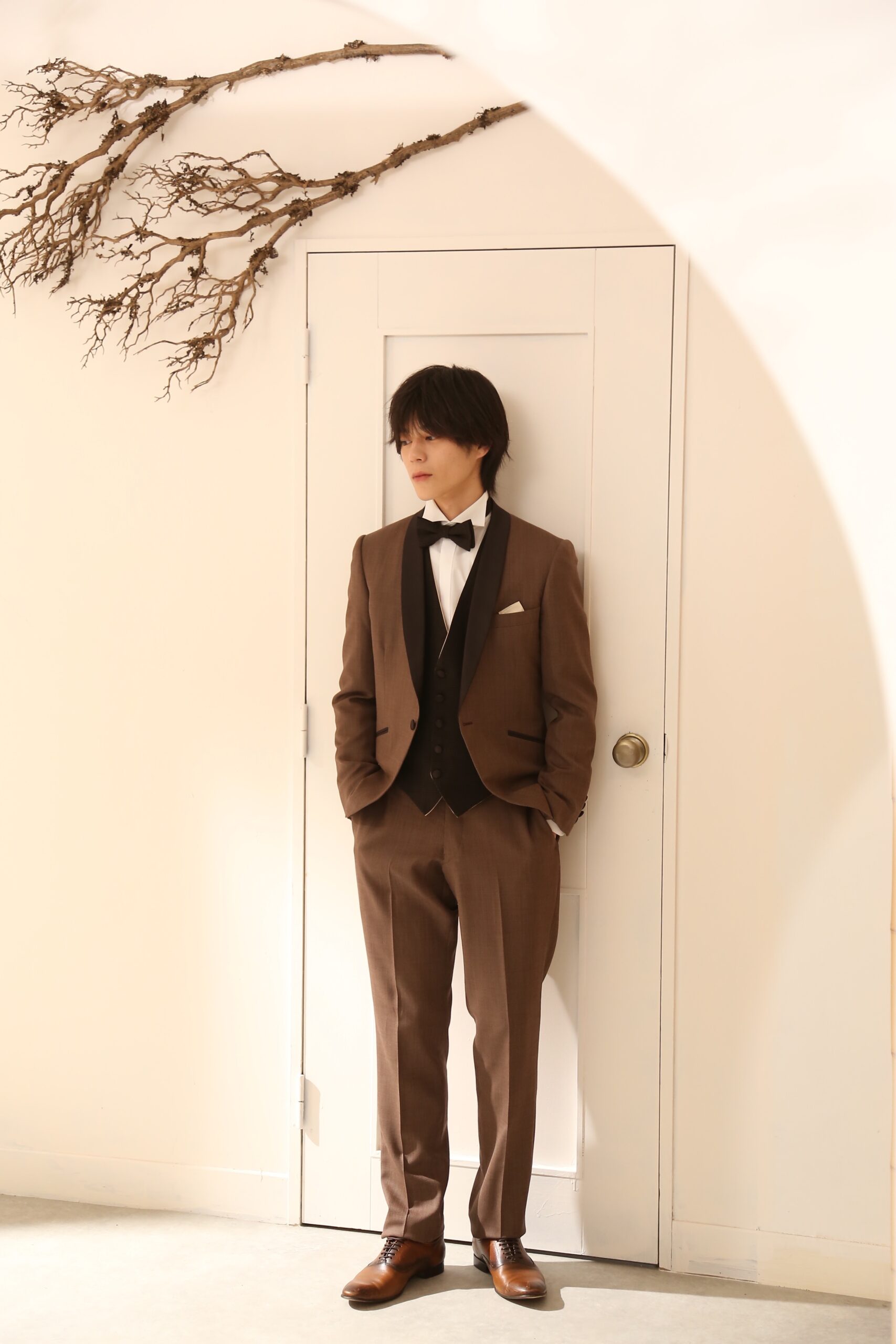 ブラウンのタキシードは、ベージュ系ドレスとも相性◎。
