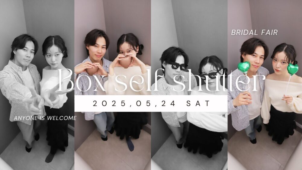皆さんこんにちは! Palette帯広店より5/24(土)限定で今流行りのボックスセルフシャッターが無料で体験できるイベントを開催いたします! ご入籍お済みの方やこれからご入籍予定の方までみなさま大歓迎です♪ ”ウエディングフォトのきっかけ”に私服でのセルフシャッターを試してみませんか?? イベントのご予約はお電話またはホームページ・Instagram・公式LINEから◎