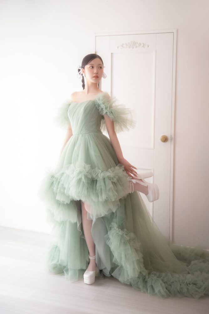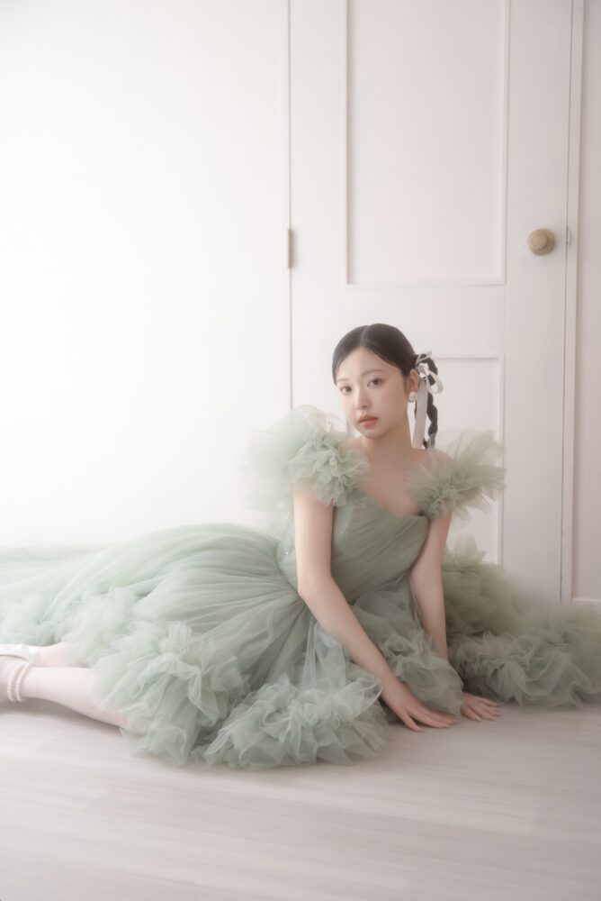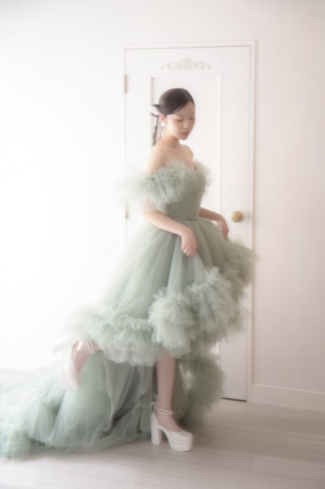 柔らかくどこかレトロな雰囲気を感じるテイストはあなたの可愛さを底上げ。ミストの中に呑まれているような”ぽわっと”した質感にドレスのフリルとプリティーさが際立つ。