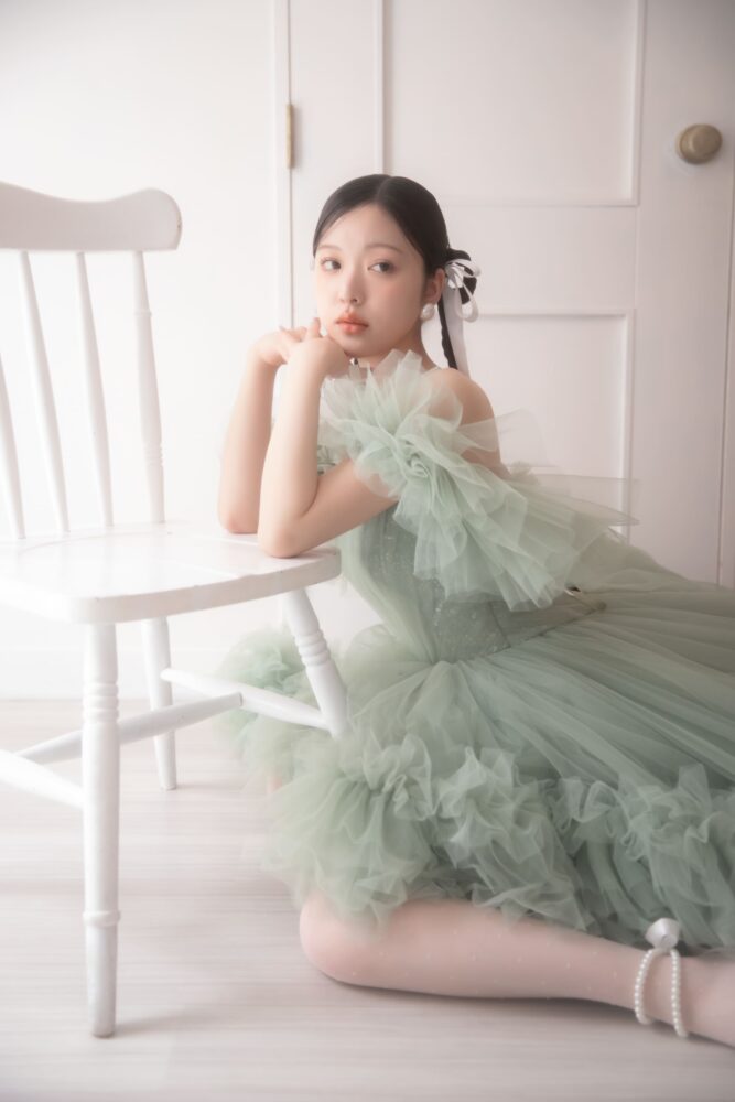 ホワイトベースのキューティーなシンプルさはピスタチオのプレミアラインドレスをより高貴に魅せ、存在感を放つ。