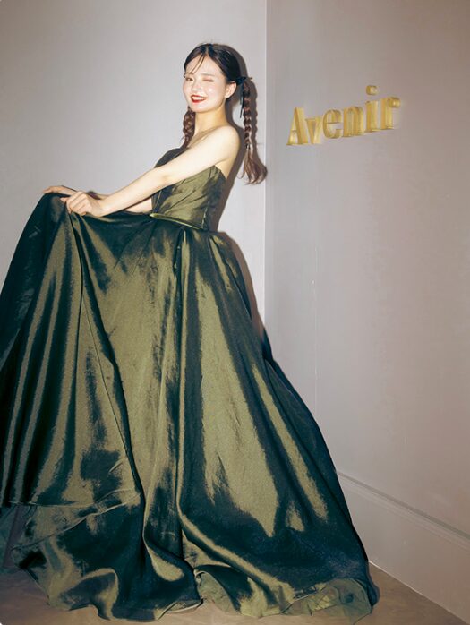 綺麗めがお好みの方におすすめ。ロケーション先のお花の色を綺麗に見せるならカーキ色で決まり◎