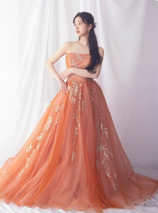 くすみオレンジ×ふわっとチュールで大人カワイイドレス!シルバーラメが、