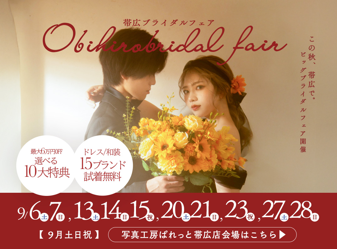こんにちは! 写真工房ぱれっと帯広店です! 毎月大好評いただいております、ブライダルフェアが 8月も開催します 毎週土日祝日のご来店・ご契約がとってもお得となっていますので、 この機会をお見逃しなく!