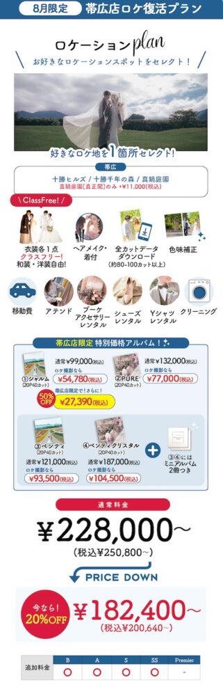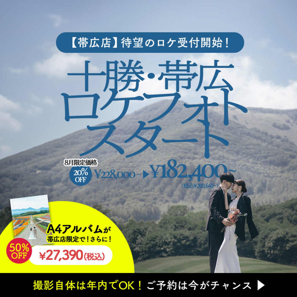 こんにちは!写真工房ぱれっと帯広店です! この度、ロケーション撮影ご希望の声にお応えし、 期間限定限定でロケーション撮影受付開始! 十勝でしか味わえない広大な自然をお洒落に撮影する、他とは被らないスタイリングでウエディングフォトを収めませんか?? そして8月限定!ご契約でなんとプラン料金20%OFF!!!! さらに、今月は帯広限定価格で20カット写真が入る[シャルムアルバム]が半額でご購入いただけるチャンスです‼︎