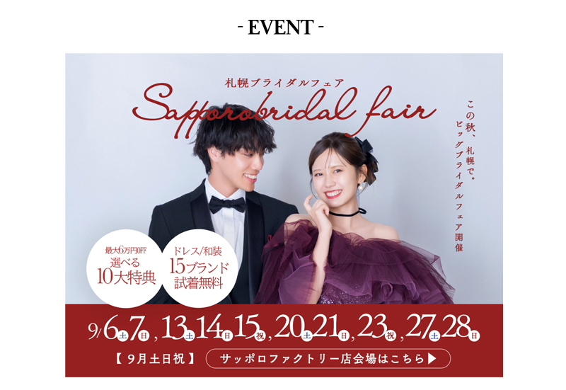 ※札幌ブライダルフェアと9月キャンペーンとの併用はできません。予めご了承くださいませ。