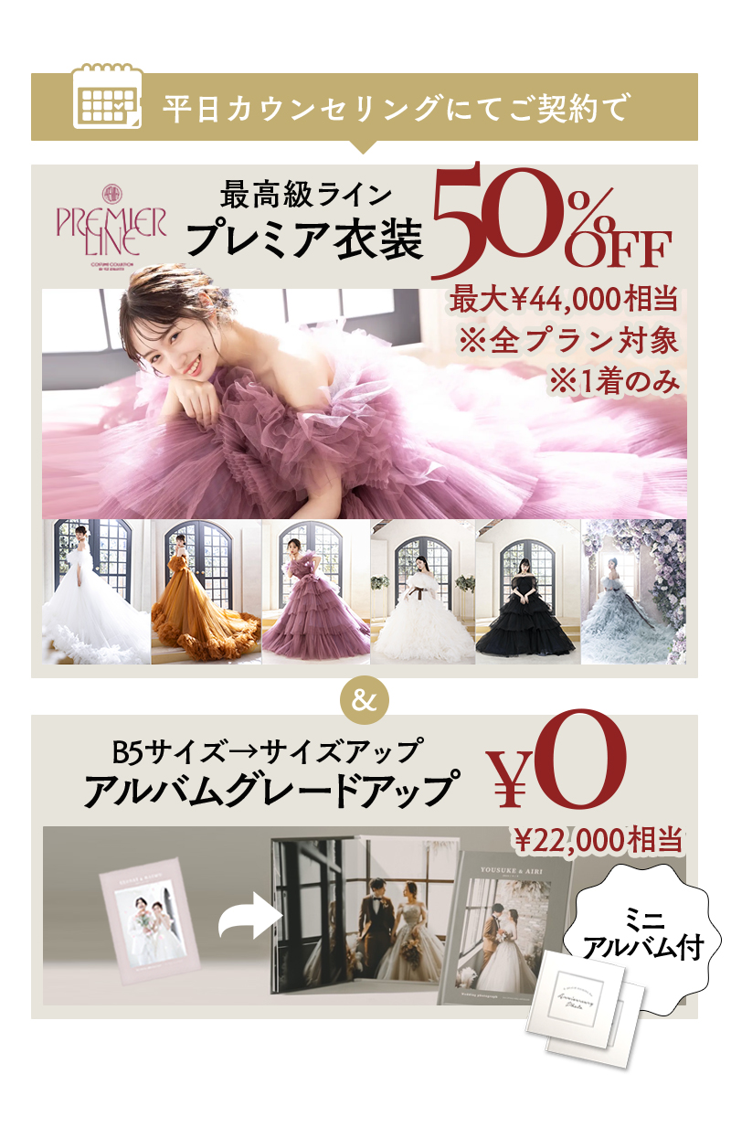 お嫁様プレミアライン衣装が通常22,000円→11,000円+税の半額でのご案内!