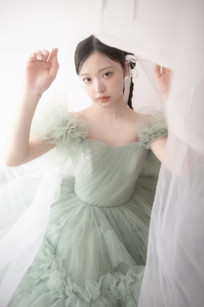 真っ白な統一感の中に映えるピスタチオカラーは入荷したばかりの新作衣装「Lulu felice」。