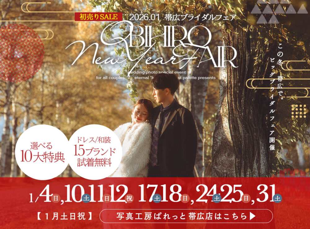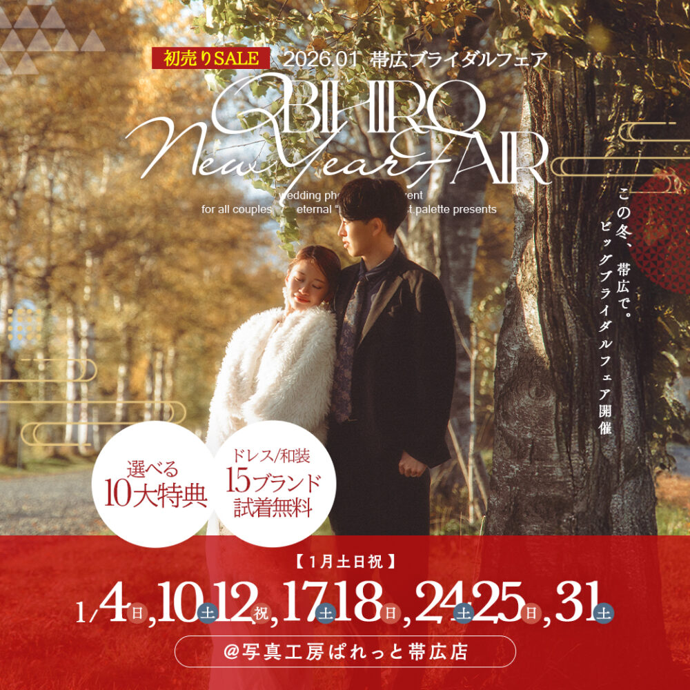 こんにちは!写真工房ぱれっと帯広店です!今回は2026年1月も開催が決定したブライダルフェアについて詳しい情報やお得な特典をご紹介していきます!! ブライダルフォトご希望の方はぜひ最後までご覧ください♩