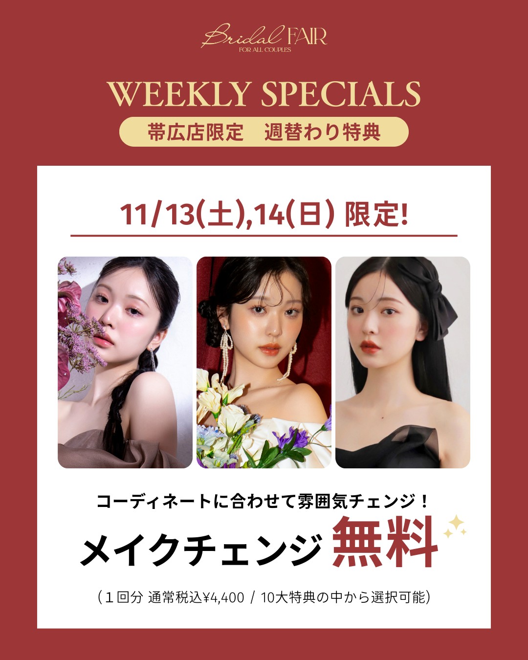 2025/12/09💍ブライダルフェア特別企画✨(12/13, 12/14 開催)花嫁の憧れを叶える週替わり特典「メイクチェンジ無料追加」!!