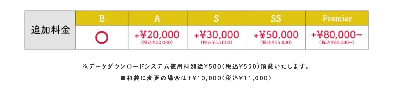 お衣装はBクラスがプラン内でご案内可能となっておりますが、Aクラス以降のお衣装に関しは追加料金をいただいております。