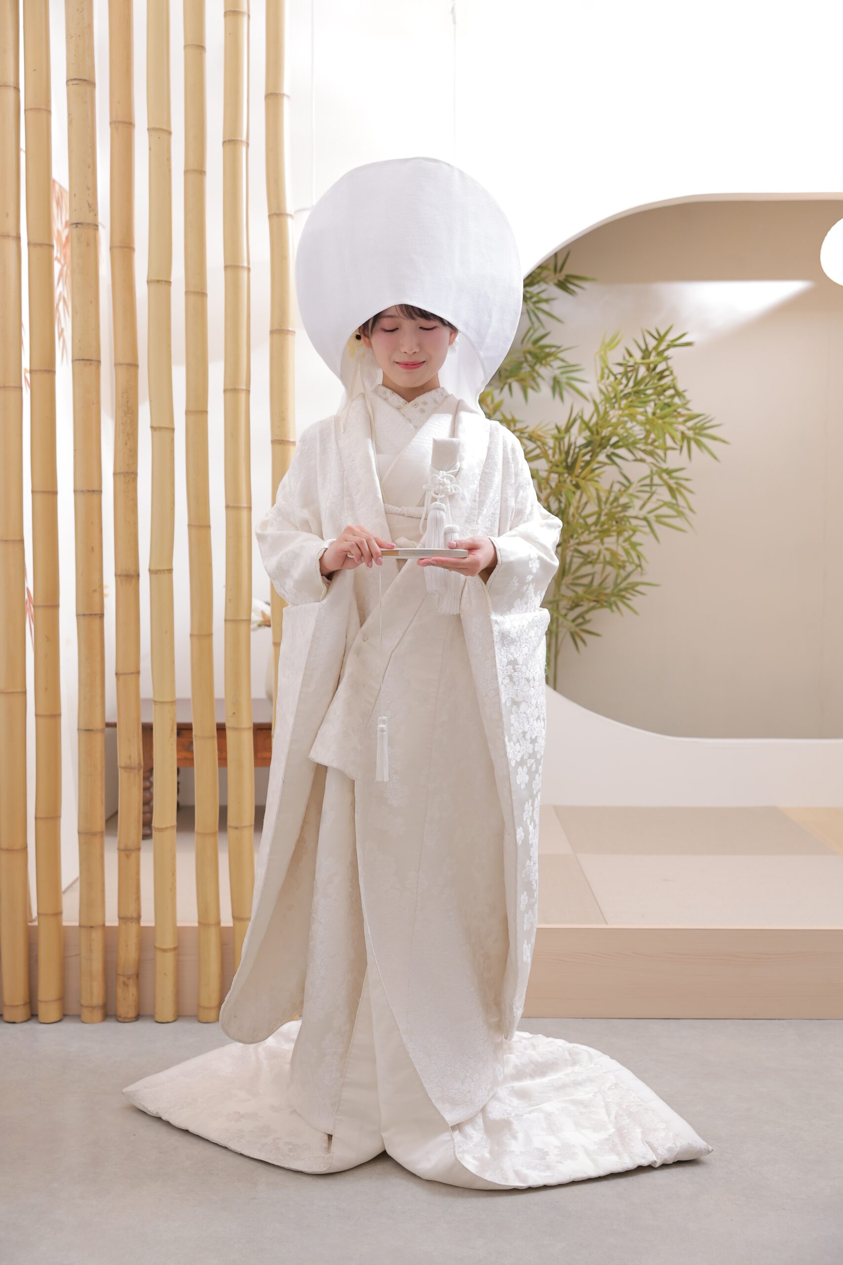 かつての白無垢といえば、文金高島田の「かつら」に重厚な綿帽子が定番でした。