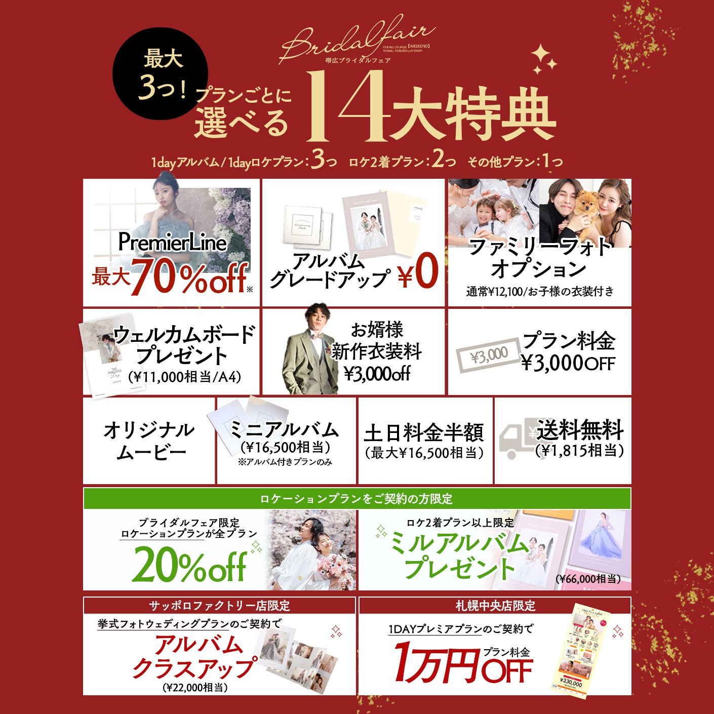 当日はブライダルフェアも同時開催中なので、オンラインで当日ご成約いただいた方には、豪華な特典をご用意しております。