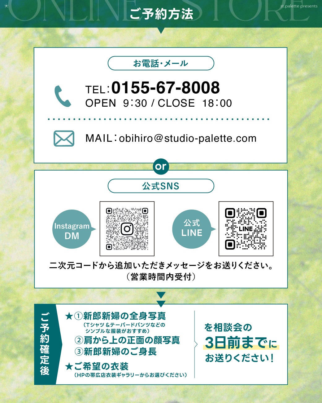ご予約: お電話、LINE、またはInstagramのDMからお申し込みください。