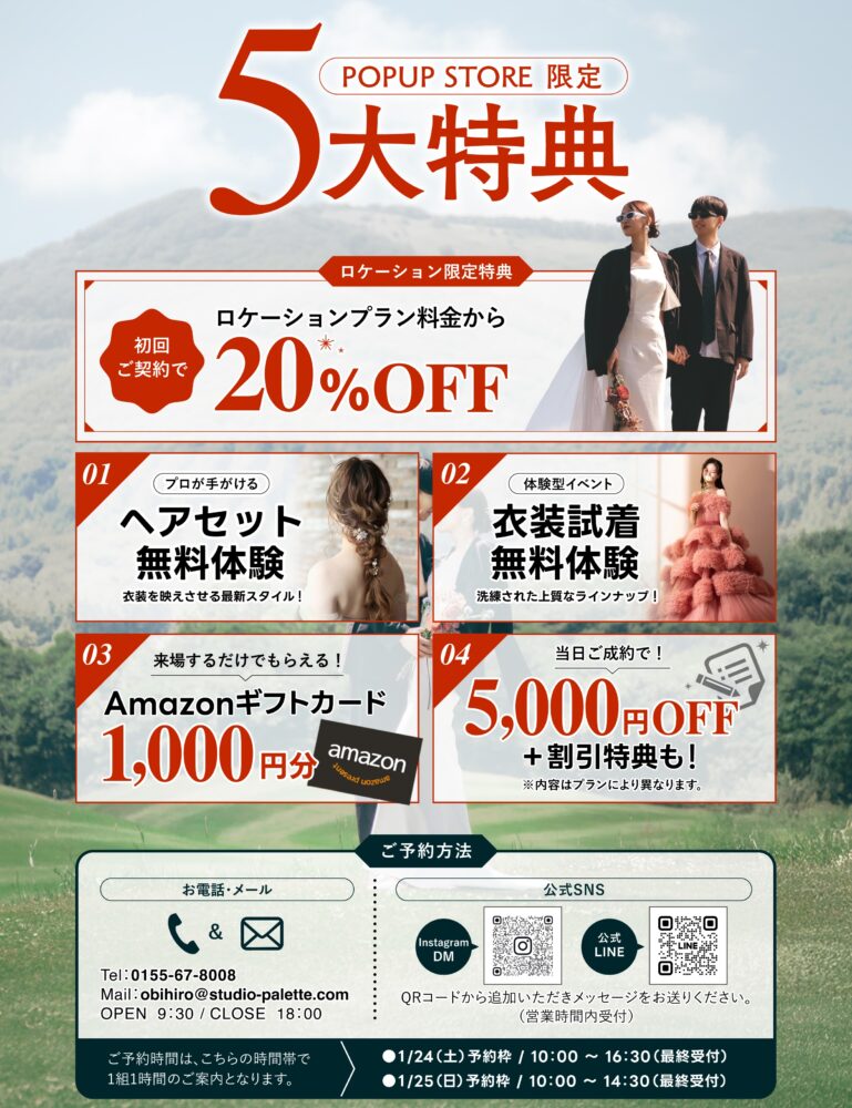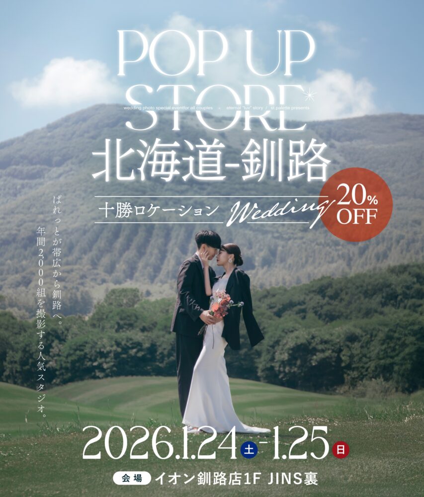 こんにちは。 北海道帯広市にある写真工房ぱれっと帯広店です! 今年1月と4月に行い、大好評だった、 写真工房ぱれっと帯広店の釧路POP-UPストアを、 2026年1月24日・25日に開催します💖 今回はロケーションウェディングの受付も開始! ウェディングロケーションのあれこれを聞きに来ませんか?