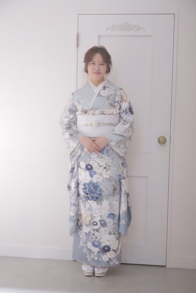 今回は第3弾で水色のくすみカラーの振袖を使用して撮影を行いました。