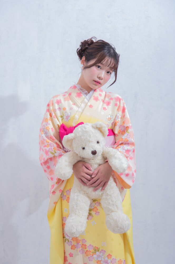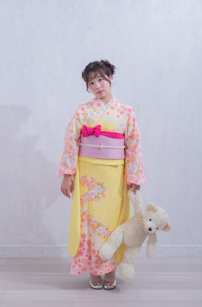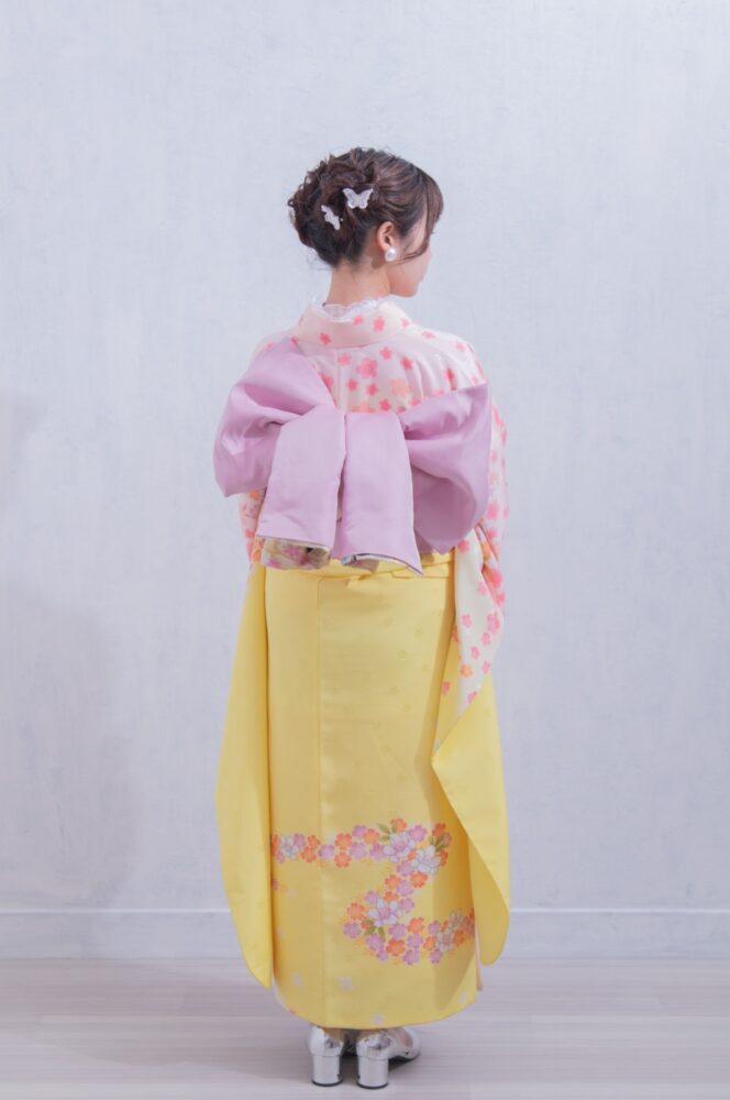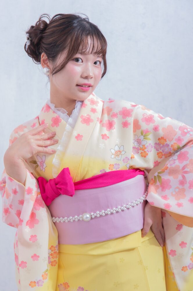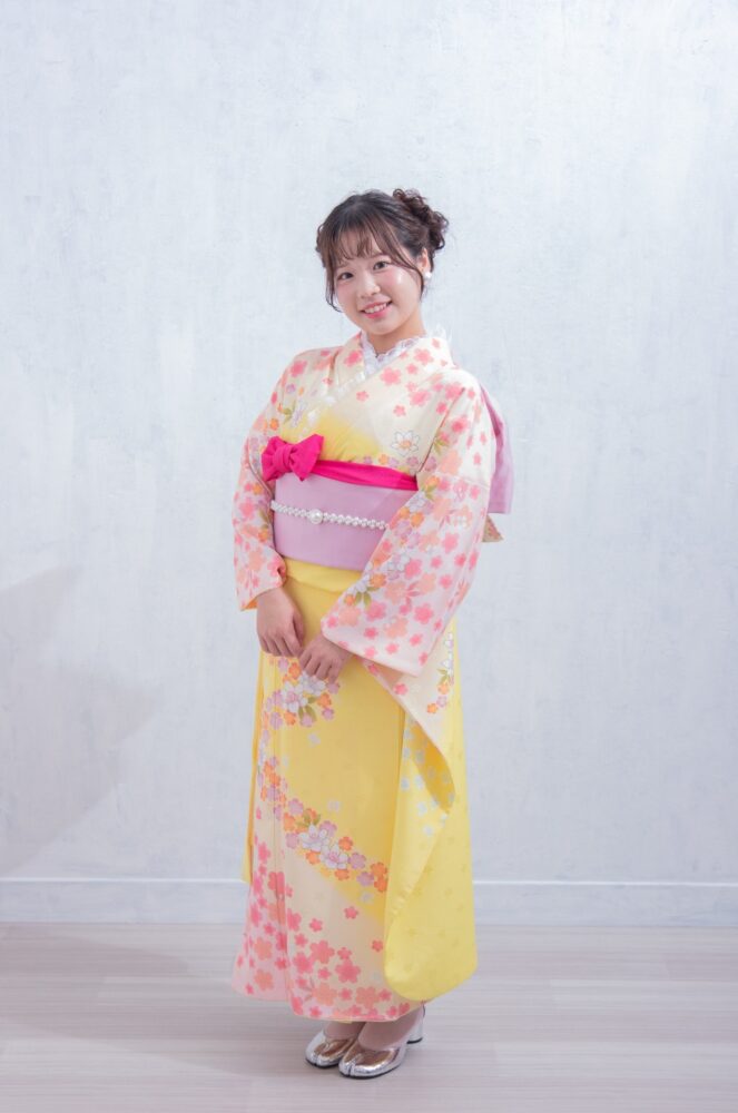 こちらの振袖は黄色の生地に可愛らしいピンクのお花が散りばめられた振袖になります。
