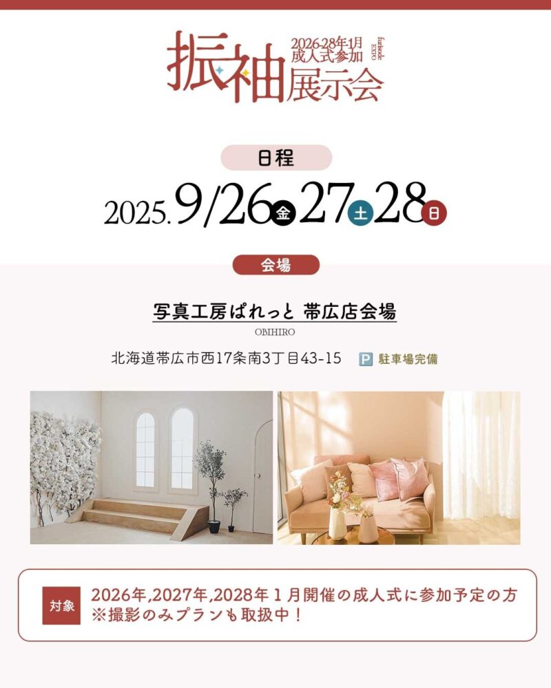 こんにちは! 写真工房ぱれっと帯広店です! 今回は9月26日〜28日に開催される振袖展示会について 深掘りしていこうと思います! 2026年度の成人さんはもちろん、 2027年度・2028年度の成人さんも要チェックです!!