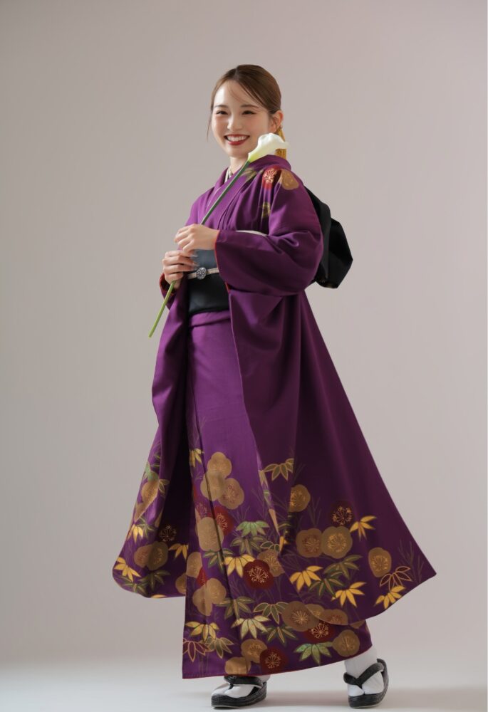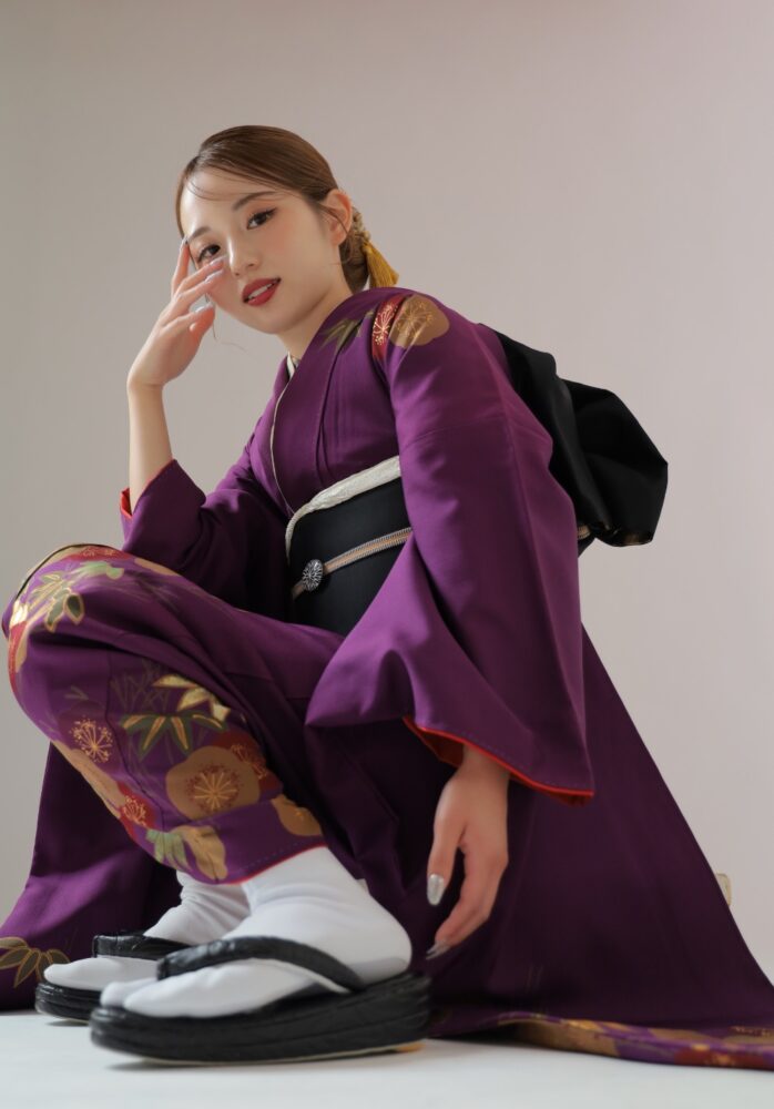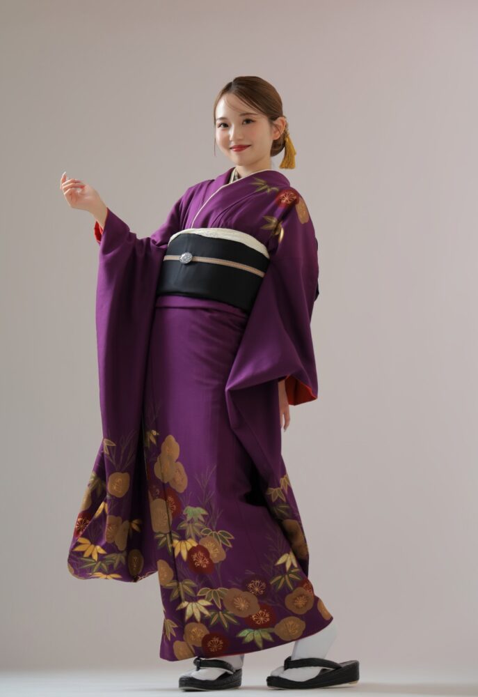 紫のシンプルな振袖に足元の方に古典柄が入ってます!