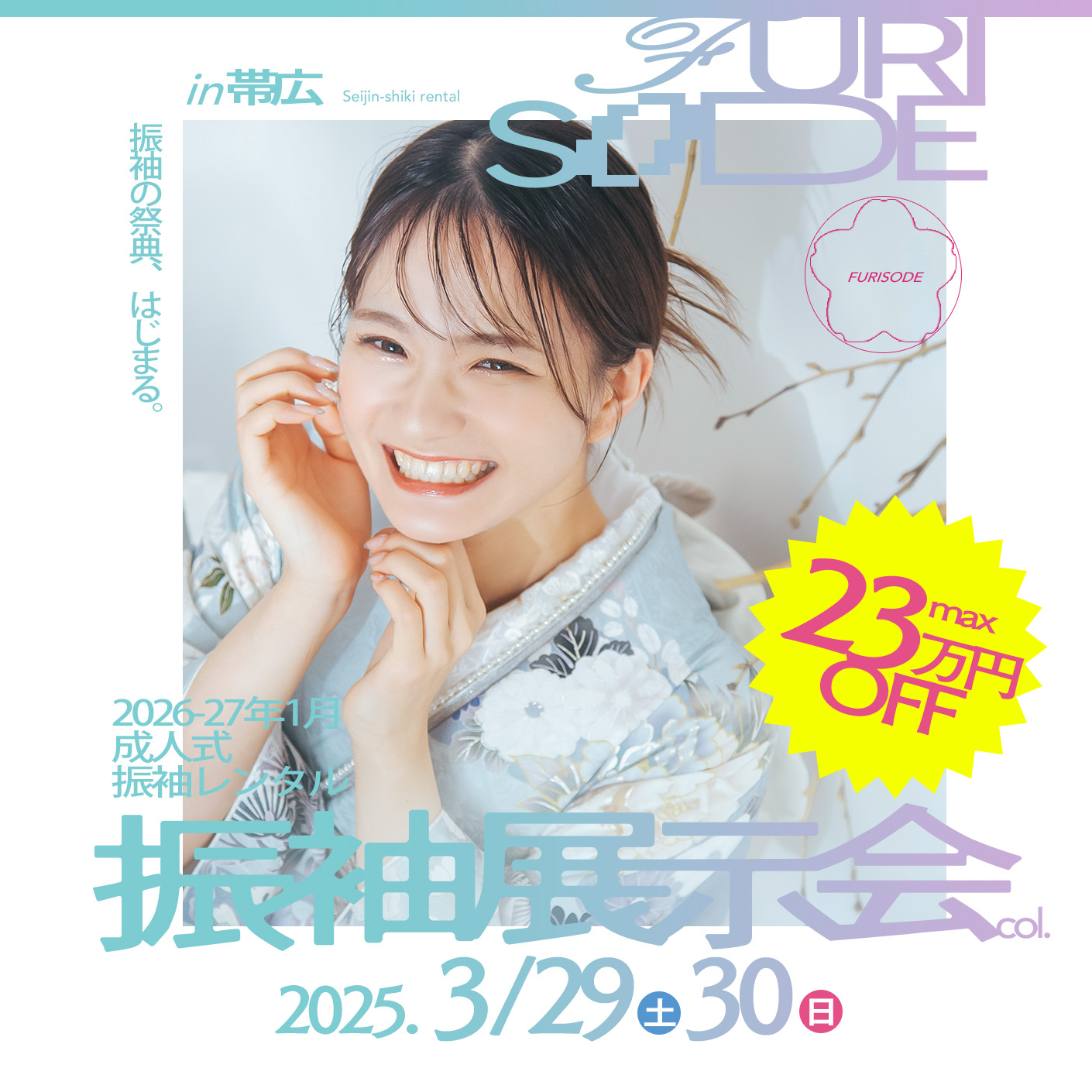 2026-28年1月成人式参加の皆様向けに、3/29,3/30に帯広店にて振袖展示会開催決定!お得な特典が盛りだくさん!ぜひチェックしてみてくださいね♡