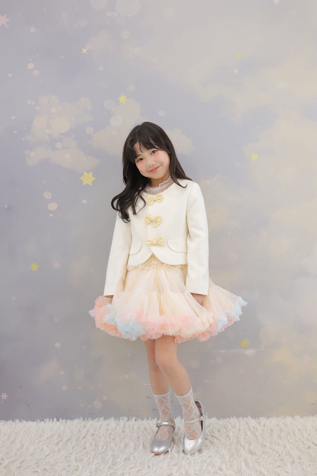 ツイード調の白ジャケットに、まるでドレスみたいなフワフワチュールスカートのセットアップ。