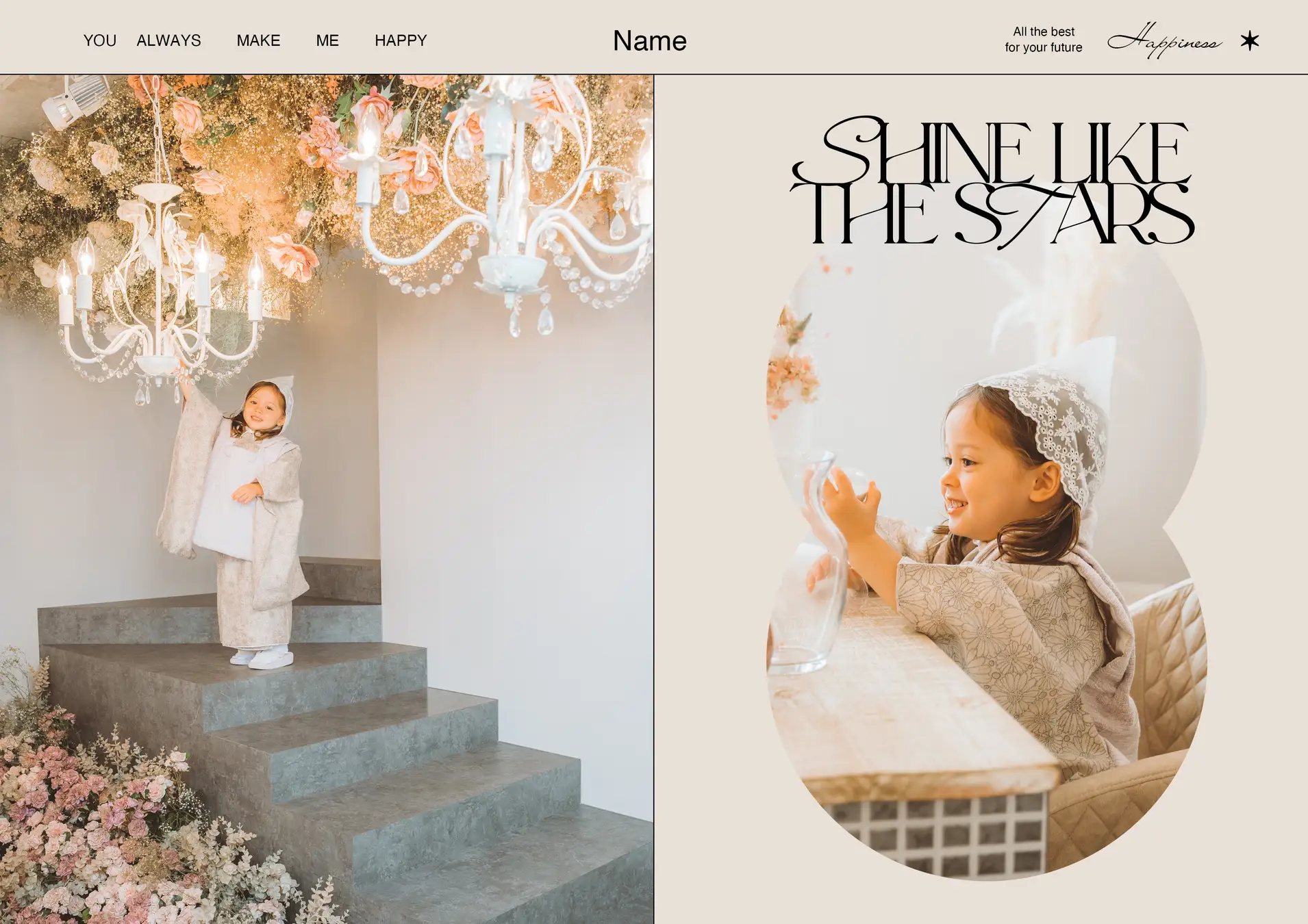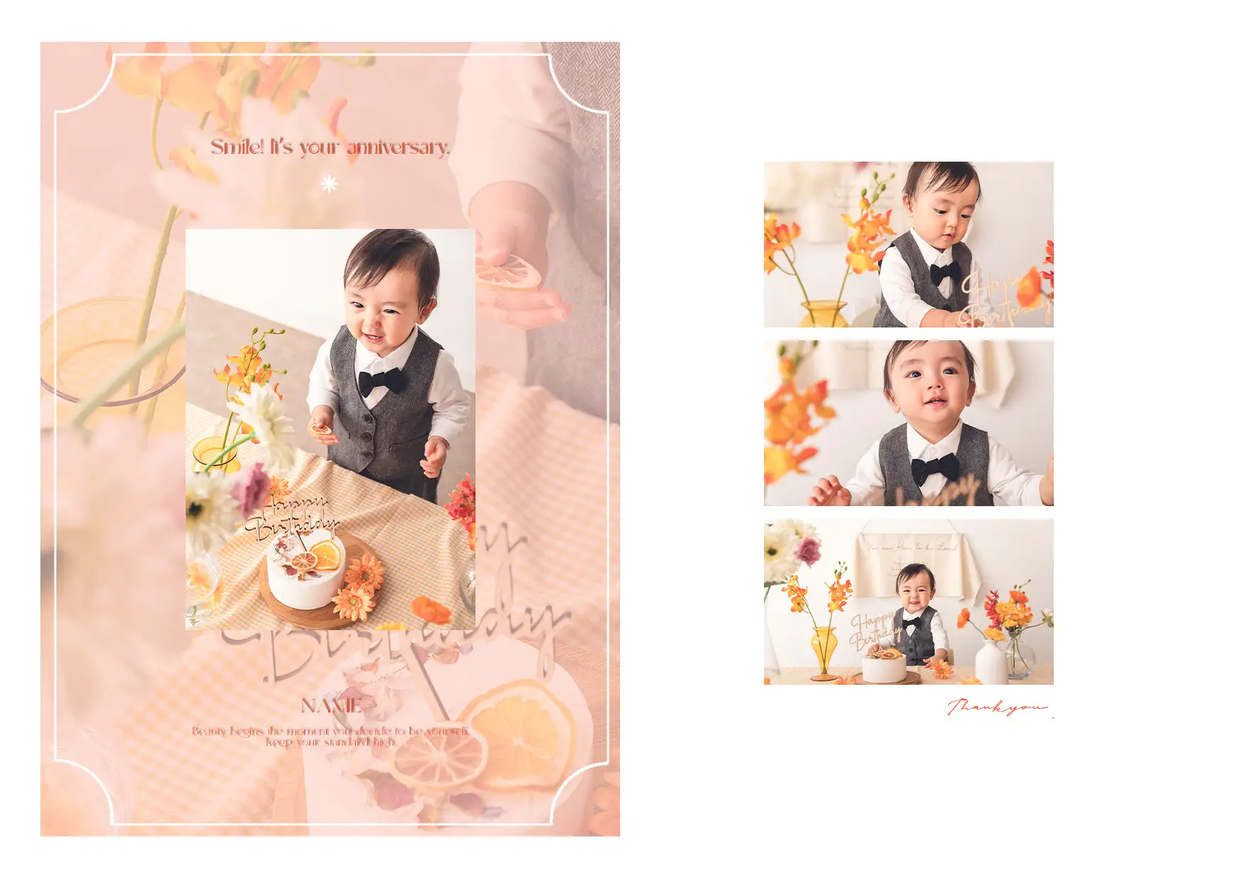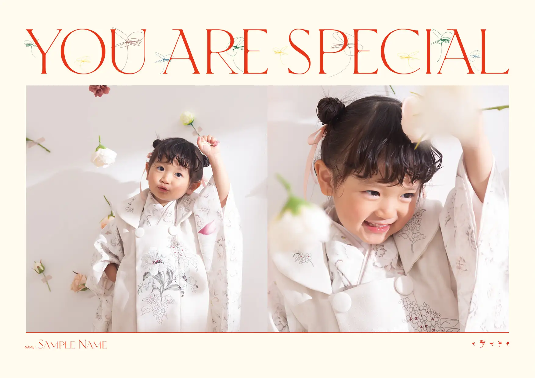 大切なご記念、お子様の成長をお祝いするとともに、仕上がった写真をより素敵に残せるよう、バリエーション豊かなデザインを提案いたします。