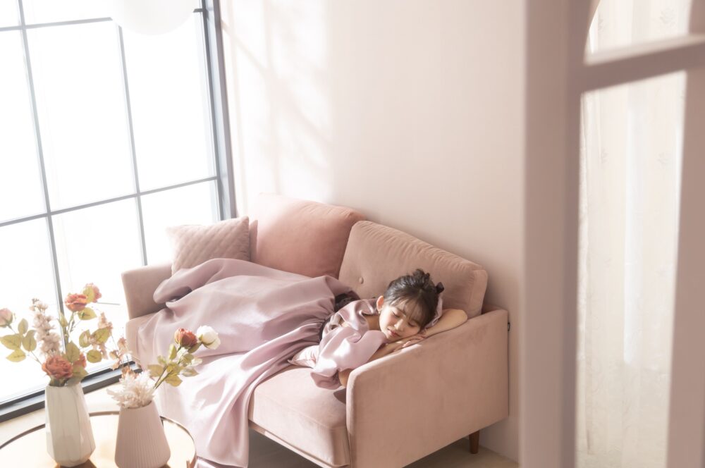 ピンクの壁の可愛らしいお部屋風のセットで、くつろぎながら自然な表情を!