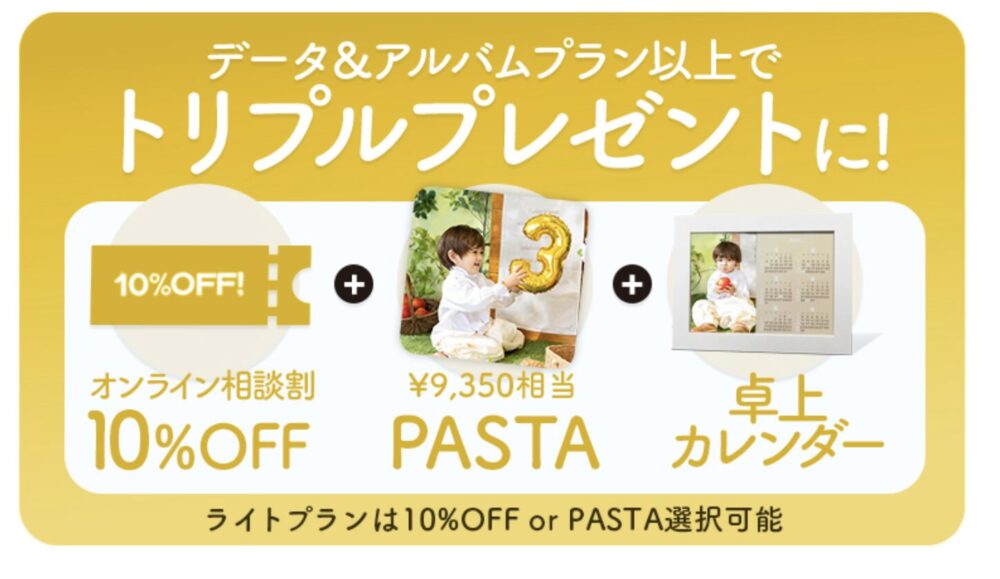 データ&アルバムプラン→オンライン相談事前支払いで料金10%OFF + PASTA&卓上カレンダープレゼント
