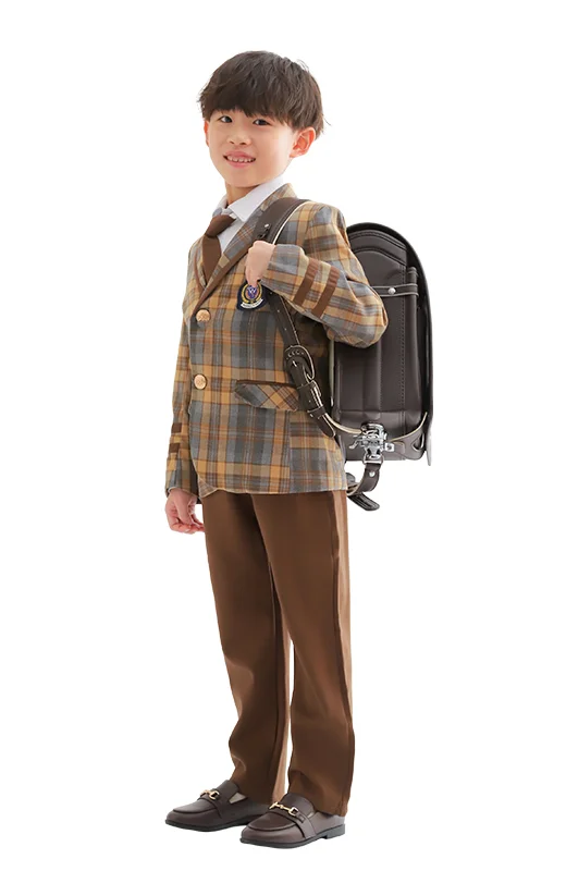 入学カット: 新しいスーツとランドセルに着替えて。