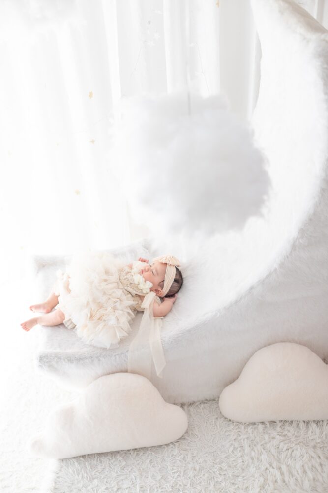 夜空をイメージした空間には、大きな月のオブジェやふわふわの雲が…!🌙