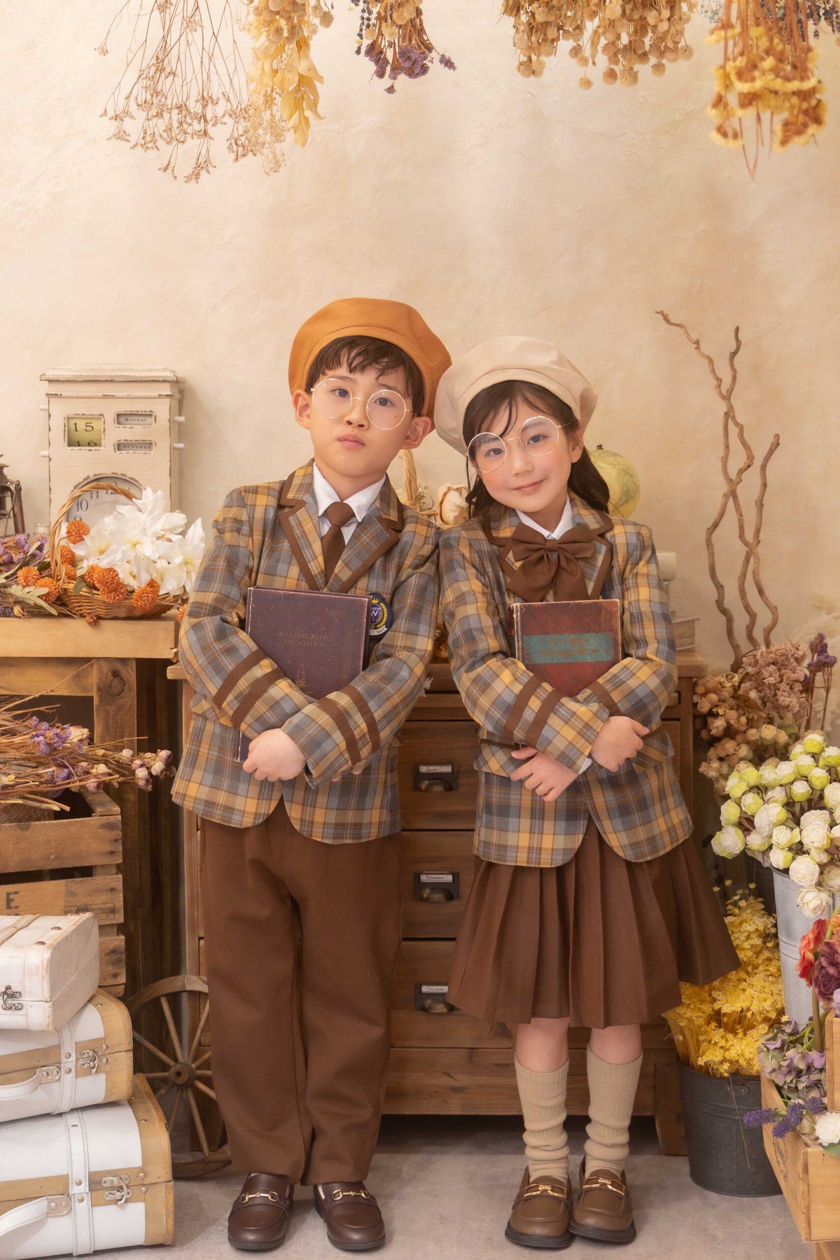男の子: スタイリッシュなジャケパンスタイルや、少し大人っぽいネクタイ。