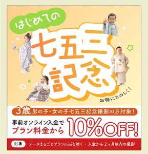 写真工房ぱれっと帯広店では七五三の撮影を一年中やっております! お誕生日に撮りたい方、暖かくなってからお参りに行きたい方など是非ご予約下さい! 今月はオンライン相談で3つの特典が付いてきます♪