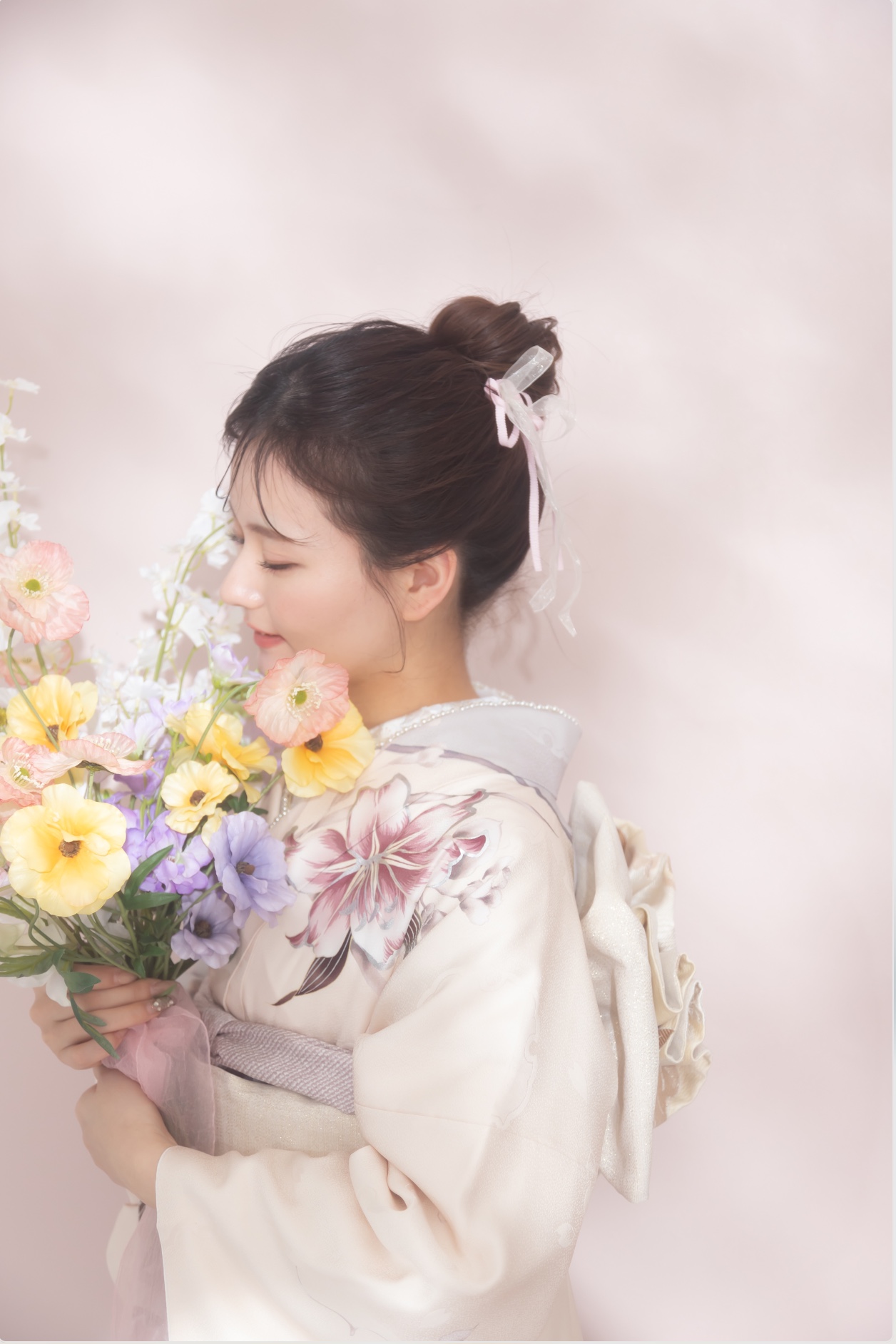 優しい色の背景と着物にカラフルなお花が可愛い!