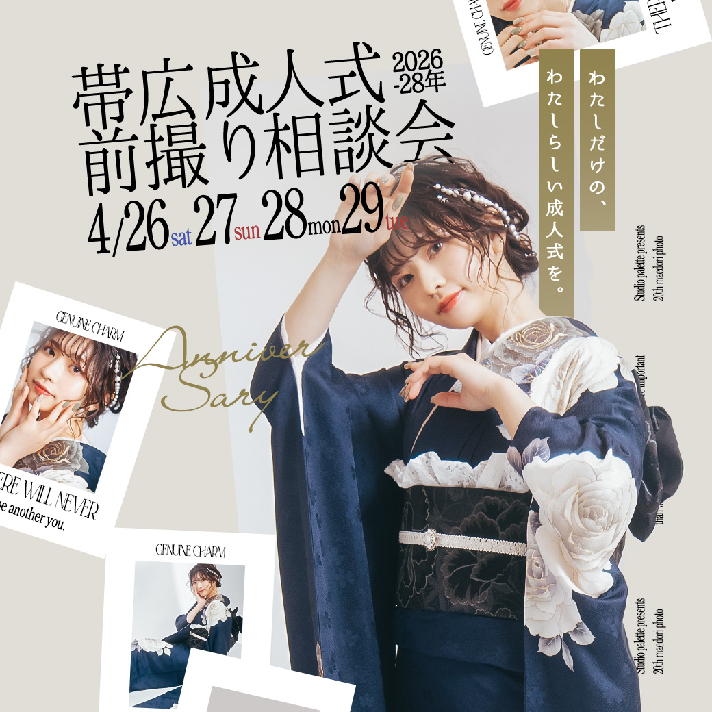 写真だけの成人式(前・後撮り)も、振袖レンタルも両方¥29,800(税込¥32,780)からご案内! こだわりのスタイリングや撮影をリーズナブルに叶えることができます。 札幌の中央区の2店舗(サッポロファクトリー、札幌大通)、帯広、旭川、函館に各1店舗と主要部に店舗展開。北海道を拠点に全ての「成人記念」が、自分史上最高の記念になるよう精一杯お手伝いをさせていただきます。 振袖は全道どこでも発送可能です!! 費用は抑えたいけどガマンもしたくない!そんなハタチの皆様へ。全てのプランが2着以上で充実したご記念が叶います。 振袖2着や、振袖&ドレスなど組み合わせも自由自在。 ブライダル撮影も取り扱っている写真工房ぱれっとだからこそ提供できる、おしゃれなデザインドレスをご用意しております。 成人式に出席をする・しないに関わらず、プロのカウンセラーが丁寧にヒアリングし想いに寄り添いプランニングいたします。イメージが固まっていなくても大丈夫!お気軽にご相談ください。 各店舗100着以上、全店舗合わせると500着以上の衣装の中から運命の1着に出会える! ご試着は全て無料です。 衣装は全てwebに掲載中!目星をつけて、ぜひご来店して試着してみるのをお勧めしております。 ①普段使うアプリで!LINE登録 ②もっと気軽に!チャット相談 ③お急ぎの方は!お電話 ④24時間対応可能!web予約&オンライン相談 お好きな方法でコンタクトをお取りください★ ・自分が探している振袖があるか知りたい ・自分に似合う振袖を提案してもらいたい ・お得なキャンペーンを知りたい ・どんな準備をしたら良いのか教えてほしい などなど、どんな些細なお問合せでも構いません!気になることはなんでもお気軽にお問合せください。 気になる店舗をLINE登録! 期間限定のキャンペーンの配信もあるのでお見逃しなく。 右下に表示されております「チャット」にて気軽に質問が可能です! オンライン相談って何?安くなるみたいだけどどうやるの?などギモンにすぐにお答えいたします★ スタッフがお答え致します! 24時間対応可能!web予約フォームが便利です。 Instagramでは最新ビジュアルやキャンペーン情報を発信中です💫 フォローしてチェックしてくださいね♡ 写真工房ぱれっとは、ハタチ記念が一生の思い出として、人生がより豊かになるような体験と写真をお届けできるよう、全力でお力添えさせていただきます。 一生に一度のご記念、ぜひ写真工房ぱれっとにお任せください。 成人式前撮り・振袖レンタルは写真工房ぱれっと