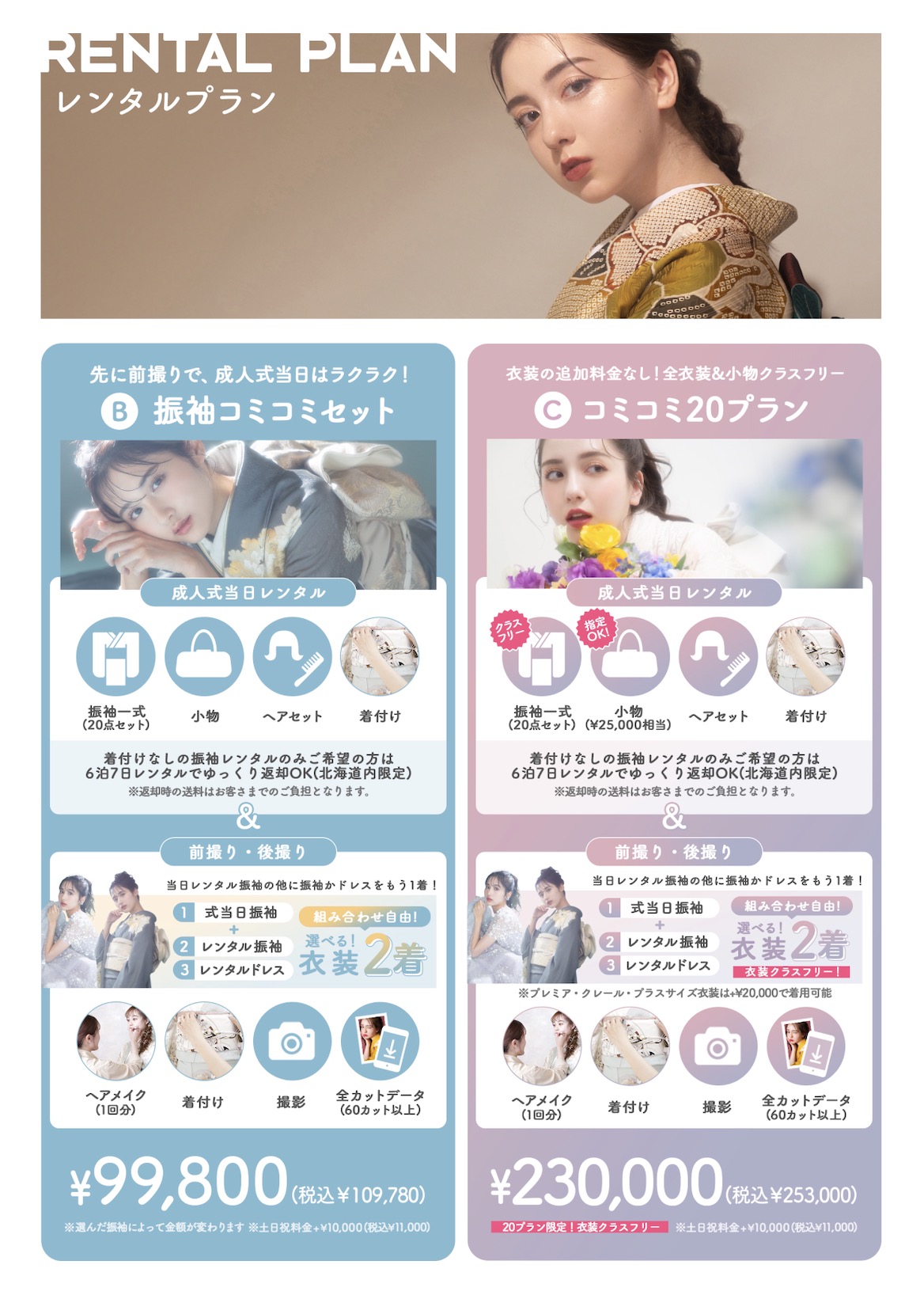 この他、前撮りと振袖レンタルのセットプランや、前撮りのみのプランもご用意しております。