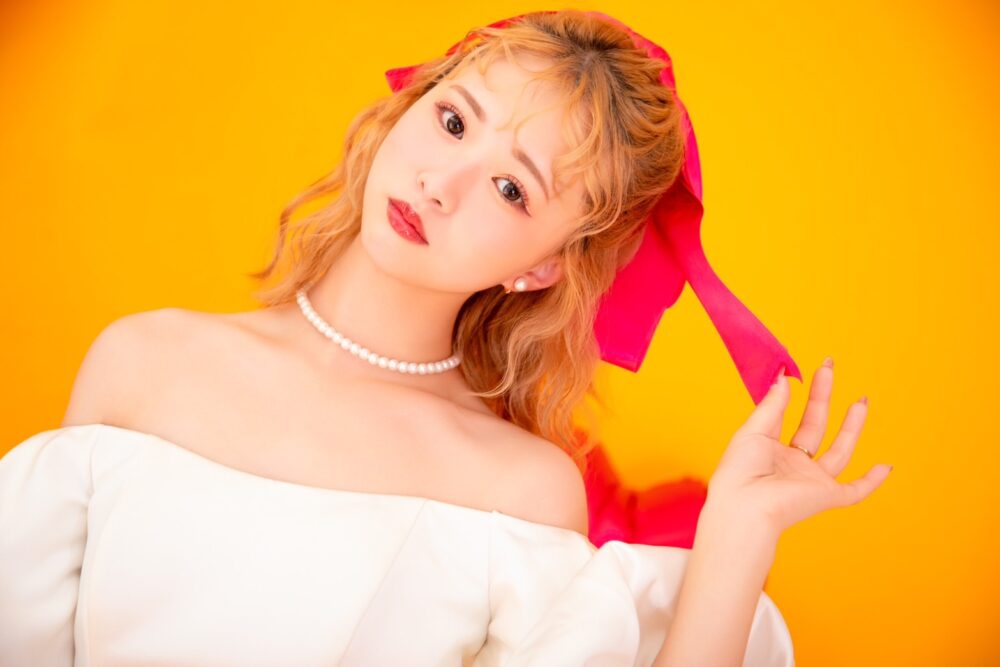 ヘアは海外ガールをイメージさせるパーマセットに高めのハーフアップでポップさ全開に!