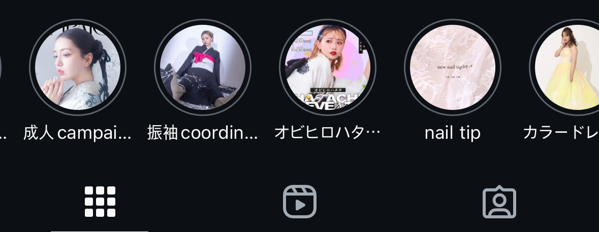 ストーリーハイライトにてその月のキャンペーンや、お衣装一覧、レンタルネイルチップのデザインを掲載しております!